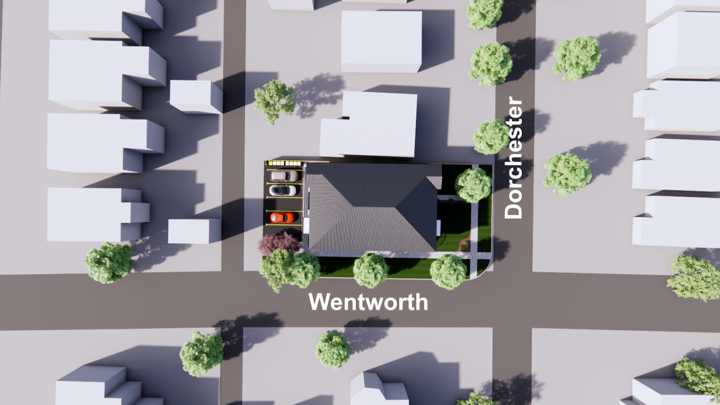 The East side yard will be 4’ with a 6’ & 4’ wood fence separating in from the adjacent residential. The West side yard (Wentworth) will be 4’ on the main floor and buffered by street edge landscaping. Additionally, the parking will be buffered from Wentworth by a 3’ planting strip and an ornate metal picket fence. The rear yard (Public Lane) will be 30’ and the front yard (Dorchester) will be 25’ with street edge landscaping.